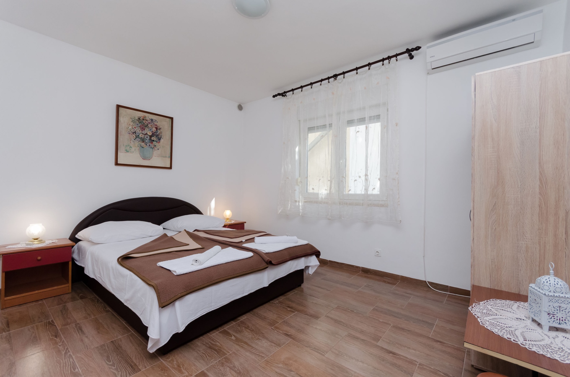 Apartman 7Fő Általános információ Kategória: 3 Emelet: első emelet Típus: A6+1 Háziállatok: Háziállat barát szálláshely- az irodával történt előzetes egyeztetés alapján (felár a helyszínen a szállásadónak fizetendő) Felület: 100 m2 Kilátás: tengerre és zöldövezetre Berendezés és felszereltség Fűtés: helyiség része Klíma: helyiség része Internet: vezeték nélküli Vasaló: kérésre Ágynemű és törölközők: Igen Önkiszolgáló bejelentkezés: Host check-in Az adott többletszolgáltatás felára a helyszínen fizetendő Háziállat: 10 €/nap Klíma: felár nélkül Fűtés: felár nélkül Internet: felár nélkül Konyha és nappali Edények és evőeszközök: Igen Sütő: Igen Főzőlap: Igen Hűtőgép: Igen Fagyasztó: Igen Mikrohullámú sütő: Igen Kávéfőző: Igen Vízforraló: Igen Mosogatógép: Igen A kert felszerletsége Terasz: 20 m2 Fürdőszoba információ Zuhanyzós fürdőszobák száma: 2 Hajszárító: kérésre Adatok a szobákról 1 Szoba kapacitás: 2 Kétszemélyes ágyak száma: 1 A szoba alapterülete: 16 m2 Adatok a szobákról 2 Szoba kapacitás: 2 Kétszemélyes ágyak száma: 1 A szoba alapterülete: 16 m2 Adatok a szobákról 3 A szoba alapterülete: 20 m2 Kétszemélyes ágyak száma: 1 Szoba kapacitás: 3 Pótágyak száma: 1 Terasz/Erkély: Igen