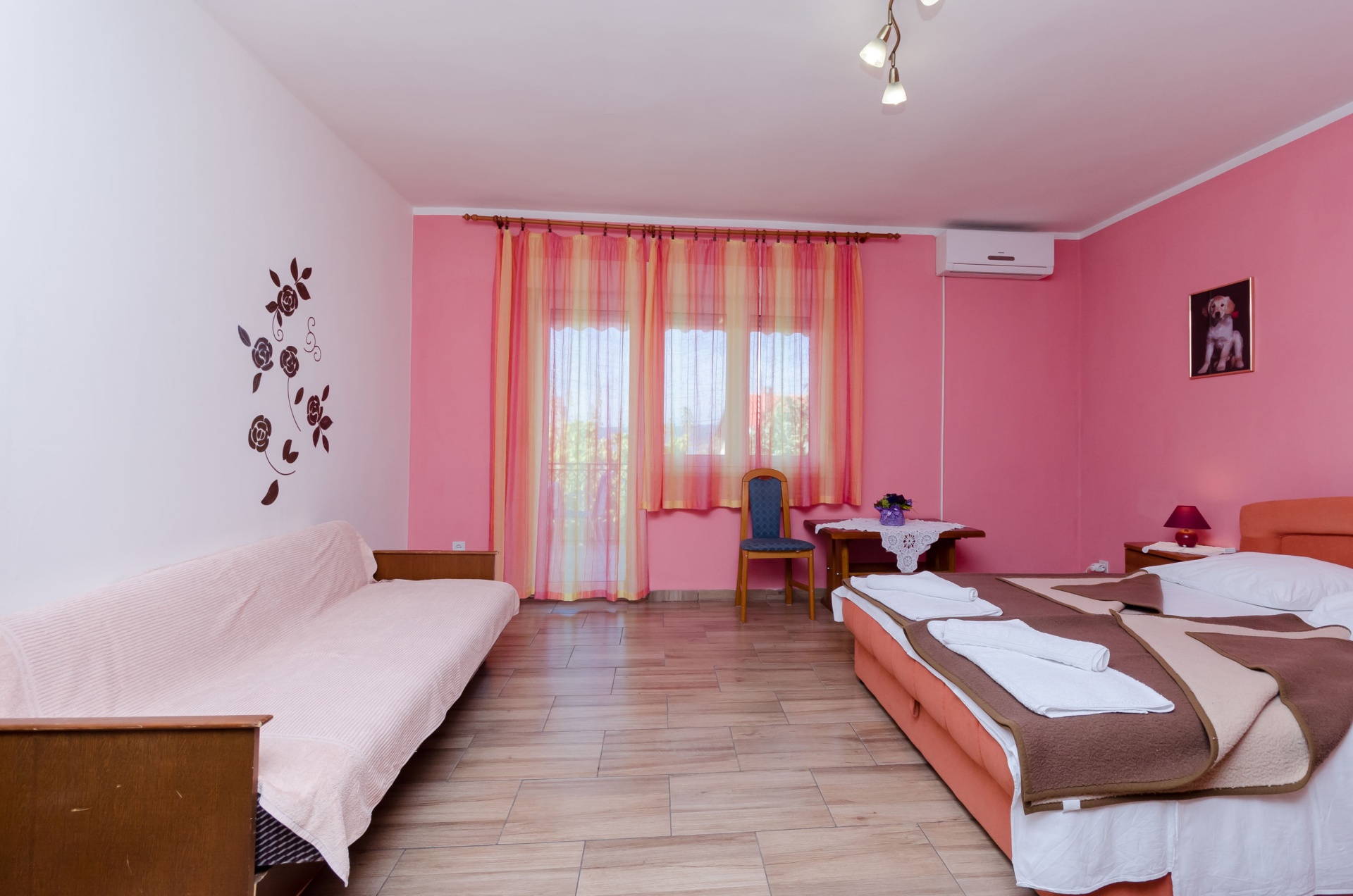 Apartman 8Fő Általános információ Kategória: 2 Emelet: második emelet Típus: A6+2 Háziállatok: Háziállat barát szálláshely- az irodával történt előzetes egyeztetés alapján (felár a helyszínen a szállásadónak fizetendő) Az apartman mérete: 100 m2 Kilátás: tengerre és zöldövezetre Berendezés és felszereltség Fűtés: helyiség része Klíma: helyiség része Internet: vezeték nélküli Vasaló: kérésre Mosógép: irodával történt előzetes megbeszélés szerint Ágynemű és törölközők: Igen Az adott többletszolgáltatás felára a helyszínen fizetendő Háziállat: 5 €/nap Klíma: felár nélkül Fűtés: felár nélkül Internet: felár nélkül További információ és szolgáltatás Takarítás: vendégváltáskor Konyha és nappali Edények és evőeszközök: Igen Sütő: Igen Főzőlap: Igen Hűtőgép: Igen Fagyasztó: Igen Mikrohullámú sütő: Igen Kávéfőző: Igen Vízforraló: Igen Mosogatógép: Igen Balkon/terasz/kert Terasz: 20 m2 Fürdőszoba információ Zuhanyzós fürdőszobák száma: 2 Hajszárító: kérésre Adatok a szobákról 1 Szoba kapacitás: 3 Kétszemélyes ágyak száma: 1 Pótágyak száma: 1 A szoba alapterülete: 16 m2 Adatok a szobákról 2 Szoba kapacitás: 2 Kétszemélyes ágyak száma: 1 A szoba alapterülete: 16 m2 Adatok a szobákról 3 Szoba kapacitás: 3 Kétszemélyes ágyak száma: 1 Pótágyak száma: 1 A szoba alapterülete: 20 m2 Terasz/Erkély: Igen
