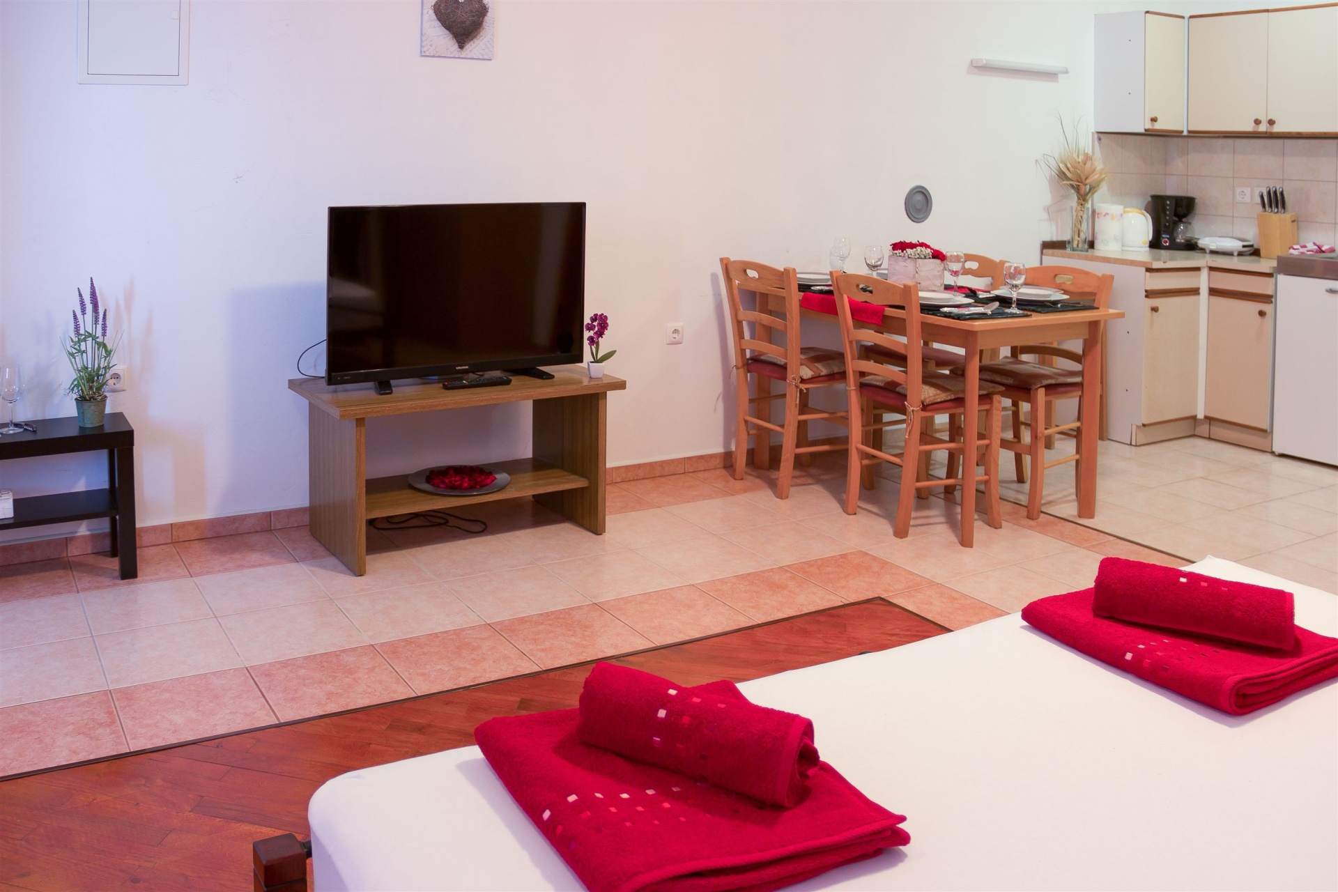 Apartman 3Fő Általános információ Kategória: 3 Emelet: földszint Típus: STUDIO Háziállatok: Háziállat barát szálláshely- az irodával történt előzetes egyeztetés alapján (felár a helyszínen a szállásadónak fizetendő) Felület: 31 m2 Kilátás: tengerre Berendezés és felszereltség Fűtés: helyiség része Klíma: helyiség része Radiókészülék: Igen Internet: vezeték nélküli Vasaló: kérésre Ágynemű és törölközők: Igen Önkiszolgáló bejelentkezés: Host check-in Az adott többletszolgáltatás felára a helyszínen fizetendő Háziállat: 7 €/nap Klíma: felár nélkül Fűtés: felár nélkül Internet: felár nélkül További információ és szolgáltatás Takarítás: vendégváltáskor Konyha és nappali Edények és evőeszközök: Igen Főzőlap: Igen Hűtőgép: Igen Kávéfőző: Igen Stúdió apartman Ágyak száma: 3 Kétszemélyes ágy: 1 Extra ágy: 1 Fürdőszoba információ Zuhanyzós fürdőszobák száma: 1 Hajszárító: kérésre A kert felszerletsége Megosztott terasz, amely minden vendég és szolgáltató számára elérhető: 50 m2