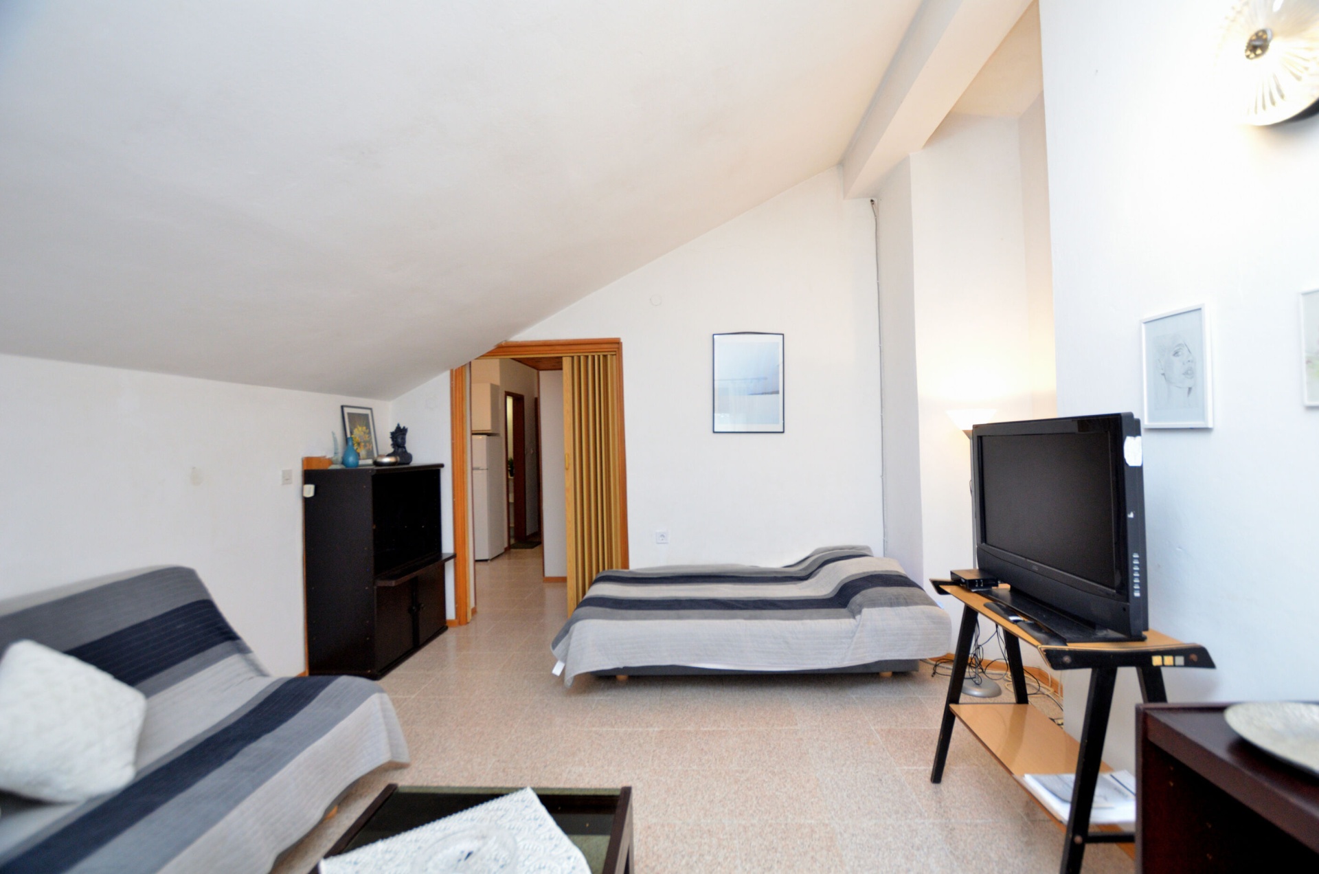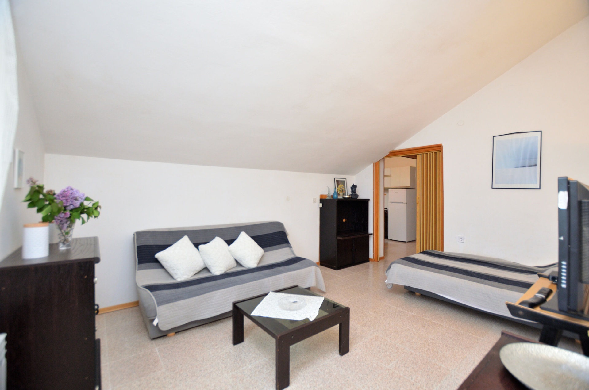 Apartman 4Fő Berendezés és felszereltség Ágynemű és törölközők: Igen Klíma: helyiség része Fűtés: helyiség része Vasaló: kérésre Internet: vezeték nélküli Önkiszolgáló bejelentkezés: Host check-in Általános információ Kategória: 3 Kilátás: tengerre és udvarra Emelet: második emelet Felület: 50 m2 A dohányzás megengedett: Igen Háziállatok: Háziállat barát szálláshely- az irodával történt előzetes egyeztetés alapján (felár a helyszínen a szállásadónak fizetendő) Típus: A2+2 Konyha és nappali Pótágyak száma (nappaliban, étkezőben, konyhában): 2 Edények és evőeszközök: Igen Fagyasztó: Igen Hűtőgép: Igen Főzőlap: Igen Sütő: Igen Vízforraló: Igen Fürdőszoba információ Zuhanyzós fürdőszobák száma: 1 Az adott többletszolgáltatás felára a helyszínen fizetendő Internet: felár nélkül Klíma: felár nélkül Fűtés: felár nélkül Háziállat: 10 €/nap A kert felszerletsége Erkély: 10 m2 Adatok a szobákról 1 Terasz/Erkély: Igen A szoba alapterülete: 15 m2 Szoba kapacitás: 2 Kétszemélyes ágyak száma: 1