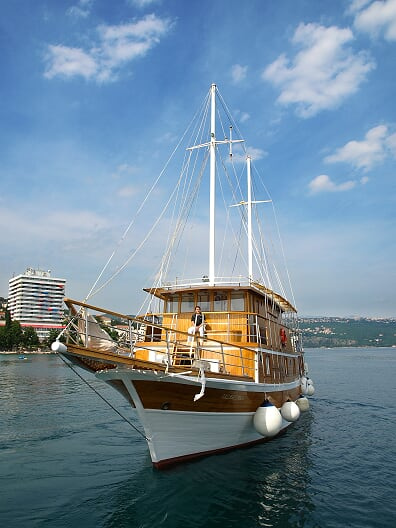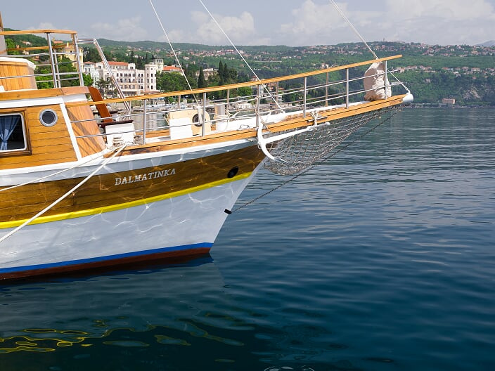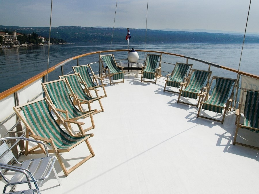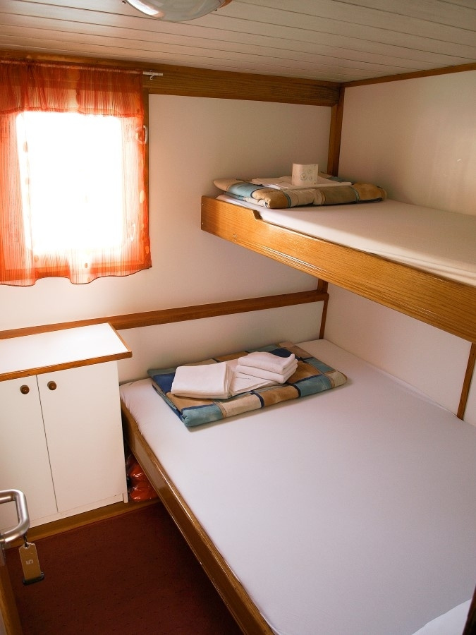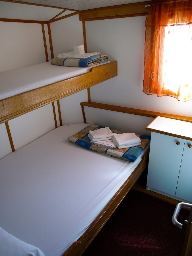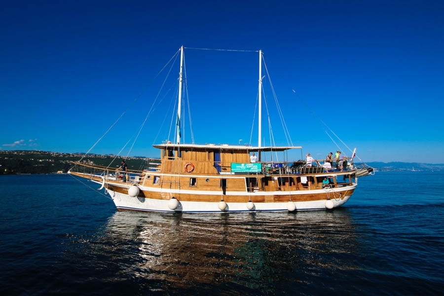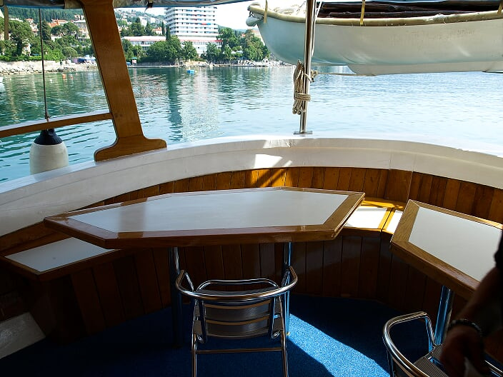 DALMATINKA HAJÓ: Max. 20 fő elhelyezésére alkalmas. fahajó, klimatizált kabinok, saját zuhanyzóval, wc-vel, főleg emeletes ágyakkal, klimatizát szalon. 53m2-es napozóterasz.