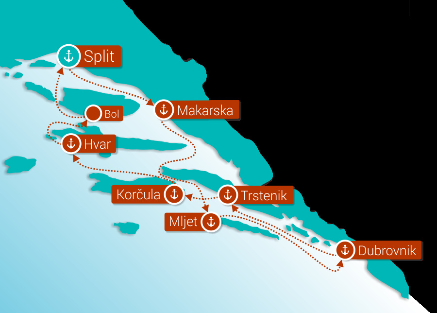 ÚTVONAL: SPLIT - MAKARSKA - MLJET - DUBROVNIK - ŠIPAN / TRSTENIK -KORČULA - HVAR - (BOL) SPLIT