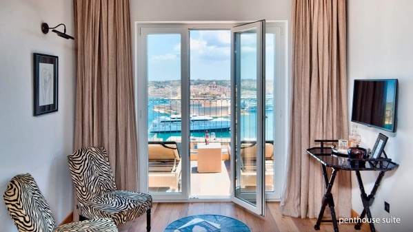 A penthouse lakosztály körülbelül 57 m?-es, elegáns kialakítású, nappali és hálószoba optikailag elválasztva található benne. Két fürdőszobával rendelkezik - az egyik zuhannyal, a másik káddal felszerelt -, továbbá műholdas televízió, széf, Nespresso kávéfőző, erkély vagy terasz is tartozik hozzá, kilátással Vallettára és a kikötőre.