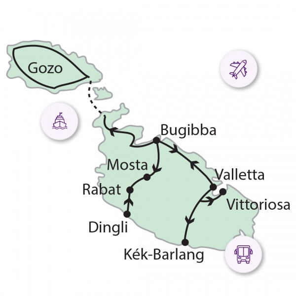 Menetrend függvényében indulás Máltára. Megérkezésünk után Valletta felfedezésére indulunk, mely méltán szerepel a Világörökségek Listáján. A legszebb nevezetességeket tekintjük meg. Első látványosságunk a Felső Barrakka kert, mely egy nyilvános park a Nagy Kikötő felett. Innen fantasztikus a panoráma a Földközi-tenger legnagyobb természetes kikötőjére, a Nagy Kikötőre, az öbölre és az azt övező épületekre, erődítményekre. A XVI. században azért alakították ki a kertet, hogy egy kis pihentető menedéket nyújtson a lovagok számára. Továbbsétálva gyönyörködhetünk a Szt. János katedrális fantasztikus díszítettségében, majd láthatjuk a híres Caravaggio festményt is. Ez a sziget legszebb egyházi épülete, amely mindenki csodálatát elnyeri. Ez volt a lovagok közös imádkozásának helyszíne. A belsejét a XVII. században alakították át máltai barokk stílusúra. Következő nevezetesség a Nagymesterek Palotája, mely 2015-ig adott helyet a máltai parlamentnek és itt van a máltai köztársasági elnök hivatala is. Reneszánsz stílusban épült és legfőbb vonzereje (tekintélyes megjelenése mellett), hogy a Johannita Lovagrend lovagi páncéljai láthatóak a palotában. A hangulatos belváros épületeit különleges, színes zárterkélyek díszítik, melyek kiváló fotótémák városnézésünk során. Programunk végén transzfer a szállodába (5 éj), majd fakultatív vacsora.