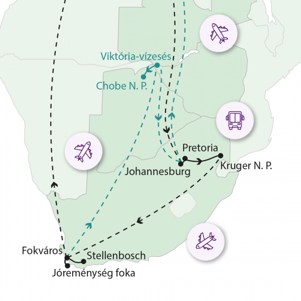 Mai napon délelőtt Jane Goodall's csimpánz és Pumbaa vadaspark túrára megyünk, mely során találkozunk védett és rehabilitáció alatt álló csimpánzokkal, megnézhetjük az etetésüket, és megfigyelhetjük játékosságukat egy erdős területen. Délután transzfer a Krüger Park repülőtérre és Fokvárosba repülünk. Érkezés után transzfer a Borvidék fővárosába Stellenboschba, ahol szállásunk is lesz (2 éj).