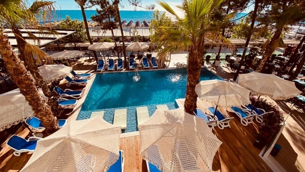 Homokos strandtól egy tengerparti sétány választja el, ingyenes napernyők és napozóágyak; all-inclusive bár. A szálloda strandtörölközőt deposit ellenében biztosít (kb.10EUR)