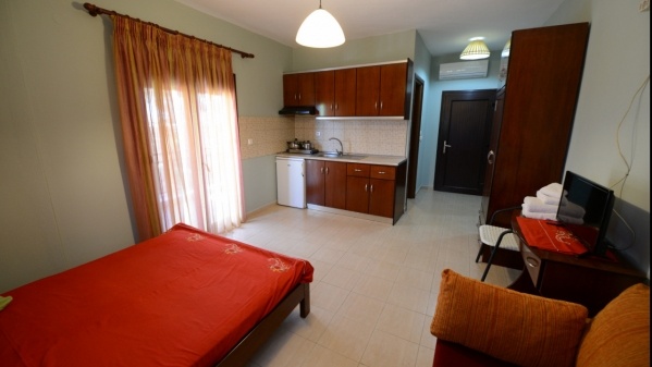 Sarti Beachhez közel, a falu szélén, csendes részen található. Központ: 2000 m, Strand: 300 m.