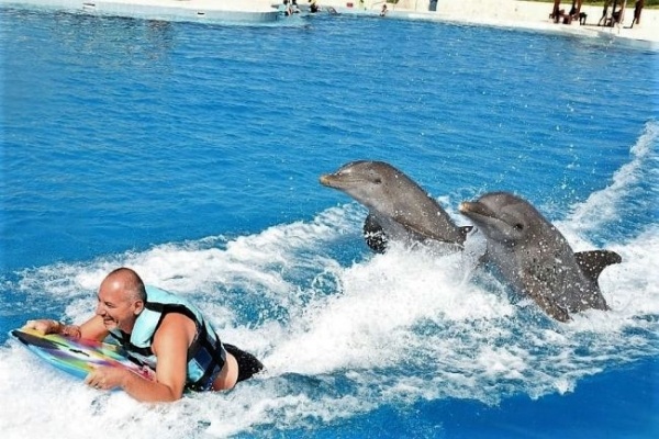 3. opció: Royal Swim (60 perces): itt két delfin van egyszerre, és felemelik az embert a levegőbe a talpánál fogva. A program ára 199 USD/fő, helyszínen fizetendő.
