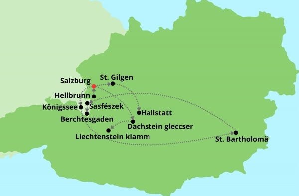 Indulás a kora reggeli órákban. Első állomásunk a Hellbrunn kastély, ahol 400 éve működő vízijátékok gondoskodnak a kacagásról és meglepetésekről. A kastély egy igazi barokk játszótér: rejtett szökőkutak, mozgó figurák, titkos barlangok és egy kiszámíthatatlan víziparádé fogad minket - méltán az egyik legkülönlegesebb élmény Ausztriában. A nap végén pedig szállásunk elfoglalása Salzburg környékén.