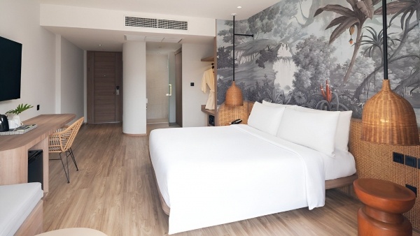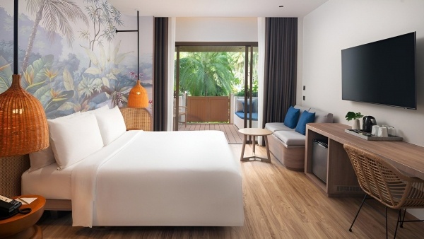 Deluxe kertre néző kétágyas szoba: kb. 43 m?, klimatizált, félnyitott fürdőszoba (zuhanyzó, WC, hajszárító, kozmetikai csomag, köntös és papucs), vezeték nélküli internet, smart TV, telefon, széf, kávé-/teafőző készlet, kis hűtőszekrény, erkély (asztal és székek), kertre néző kilátás.