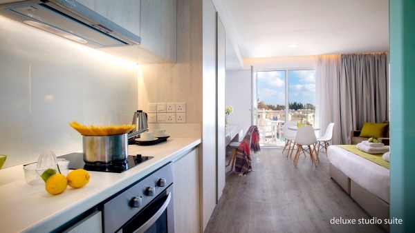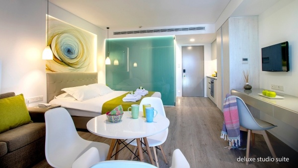 A superior apartmanok (kb. 44 m?) hálószobával és nappalival, konyhasarokkal, káddal és zuhannyal felszerelt fürdőszobával rendelkeznek, ideálisak több fő elhelyezésére. A deluxe stúdió lakosztályok (kb. 36 m?) modern berendezésűek, fürdőszobájukban zuhany, hajszárító, köntös, papucs és kozmetikai készlet található, a konyhasarok és az erkély a kényelmet szolgálja. Az executive lakosztályok (kb. 40 m?) prémium felszereltséggel, Nespresso kávéfőzővel, konyhasarokkal és medencére vagy tengerre néző erkéllyel várják a vendégeket.