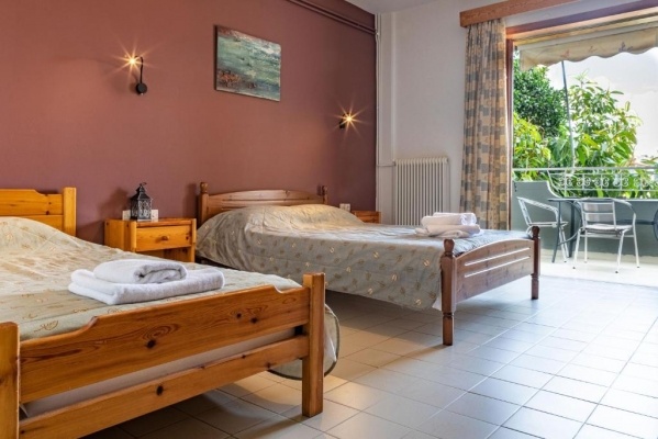 A település főutcájától és központi részétől kb. 400 méterre található a családias, 2 különálló épületből álló aparthotel. A stúdiók a hátsó épületben találhatók, amelyet egy parkoló és udvar választ el a szálloda épületétől, amely közvetlenül a tengerparton helyezkedik el. A stúdiók kb. 80 méternyi távolságra találhatók a tengerparttól. Sétányi távolságra üzletek, tavernák, kávézók találhatók.