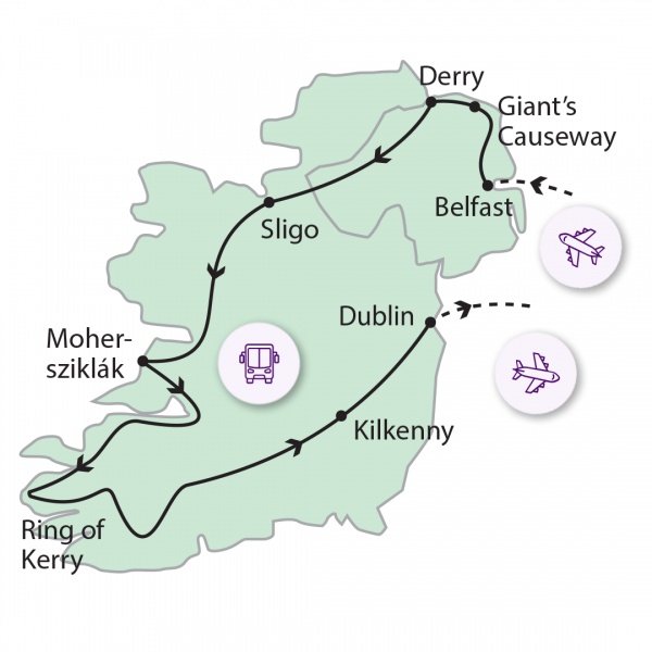 Utazás menetrend szerint a reggeli órákban az ír szigetre, ahonnan elindulunk a látnivalók felfedezésére. Belfastba érkezve buszos panoráma városnézésünk alatt megtekintjük többek között az impozáns Városházát, az Operaházat és a berlini fal belfasti alteregóját, a Békevonalat, mely még ma is áll, elválasztva egymástól a katolikus, valamint a protestáns városrészt. Ezután a kikötő felé vesszük az irányt, mely arról is híres, hogy több mint száz évvel ezelőtt itt épült a Titanic, amely 1912-ben Southamptonból indult első, s egyben utolsó útjára. A hajó rövid történetét bemutató látványos kiállításon megismerhetjük a hajógyárat, a hajó belsejét, a végzetes utazást a katasztrófáját, és annak utóéletét. Délután meglátogatunk egy whiskeylepárlót, ahol megismerkedhetünk a nemes nedű gyártási folyamatával és meg is kóstolhatjuk azt. Szállás Belfastban.