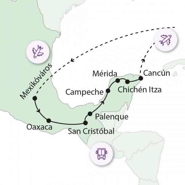 Reggel Uxmalba megyünk, mely Világörökség. A legismertebb építménye a Nagy Piramis, amely 30 méter magas, és lépcsős elrendezésével méltóságteljesen uralja a környező tájat. A piramist csillagászati szempontok szerint építették meg a maják. Délután Yucatán állam fővárosába, Méridaba utazunk, amelyet Fehér városnak is neveznek a fehérre meszelt épületek és az utcák tisztasága miatt. Városnézés, megnézzük a Paseo de Montejot, melynek mentén gyönyörű paloták, múzeumok és a kontinens egyik legrégebbi székesegyháza található.