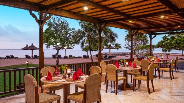 A szálloda étteremválasztéka széleskörű és változatos. A Cempaka étterem/bár a medencénél található, ahol ? la carte étkezési lehetőségek várják a vendégeket, indonéz és balinéz étkezési különlegességekkel. A Ratna étterem/bár büfé formájú étkezést kínál, elsősorban tengeri ételekkel és grillezett fogásokkal. A Soka étterem/bár a tengerparton helyezkedik el, és nemzetközi konyhát kínál büfé formájában. Emellett két bár is rendelkezésre áll: a Rijasa Lobby Bar és a Sriwedari Sunken Bar. Az All Inclusive ellátás 24 órán keresztül elérhető, reggelit 7:00-10:30 között, ebédet 13:00-14:30 között, vacsorát pedig 19:00-21:30 között kínálnak büfé formájában a választható éttermekben. Snackek 16:30-17:30 között állnak rendelkezésre a kijelölt helyeken. A Soka étteremben/bárban alkoholmentes italok és helyi alkoholos italok 24 órán át elérhetők. A 24 órás all inclusive karszalag viselése kötelező a szolgáltatások igénybevételéhez.