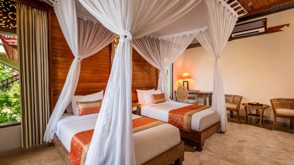 Deluxe szoba körülbelül 46 m?-es, és hasonló felszereltséggel rendelkezik, mint a bungaló változat, beleértve a légkondicionálást, a fürdőszobát kád vagy zuhanyzóval, WC-t, hajszárítót, papucsot és yukatát. Az erkély vagy terasz itt is kertre néző, és asztallal, székekkel felszerelt. A minibár felár ellenében elérhető, fogyasztás szerint. A