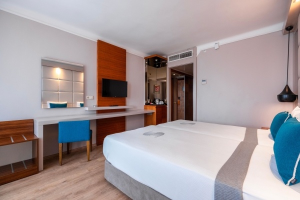 |A szobákat légkondicionáló berendezéssel, központi fűtéssel és fürdőszobával szerelték fel. A legtöbb szobában erkély gondoskodik a kilátásról. A legtöbb szoba oldalról néz a tengerre. A szőnyegpadlóval kialakított szobákban egy franciaágy vagy egy king size ágy várja a vendégeket. A gyerekeknek kiságyat biztosítanak. Van továbbá egy minibár és felár ellenében a széf is rendelkezésre áll. A kényelmet szolgálja továbbá egy hűtőszekrény és egy tea-/kávéfőző. A nyaralás kényelmét szolgálja az internet-hozzáférés, a telefon, a TV-készülék és WiFi. Mozgáskorlátozottaknak kialakított szobák is foglalhatóak. A fürdőszobák felszereléséhez zuhanyzó és fürdőkád tartozik. Rendelkezésre áll továbbá egy hajszárító. Családi szobát és nem dohányzó szobát is foglalható.