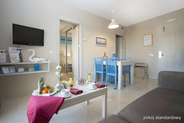 POKÓJ: stúdió: 2 fő (1 pótágy lehetséges), kb. 30 m?-es, légkondicionált, fürdőszoba (kád vagy zuhanyozó, WC; hajszárító), vizuálisan elválasztott hálószoba, felszerelt konyhasarok (kis hűtőszekrény, mikrohullámú sütő, főzőlap, mosogató, konyhai eszközök), vezeték nélküli internet, műholdas TV; erkély vagy terasz (asztal és székek), kilátás a környékre; alapértelmezett: 2 fős (1 pótágy egy felnőtt vagy 2 gyerek részére - kihúzható kanapé), kb. 40 m?, hálószoba és nappali ajtóval elválasztva, stúdió berendezéssel; erkély vagy terasz (asztal és székek), kilátás a környékre; kilátás az úszómedencére térítés ellenében; oldalsó kilátás a tengerre felár ellenében; standard szoba felár ellenében.