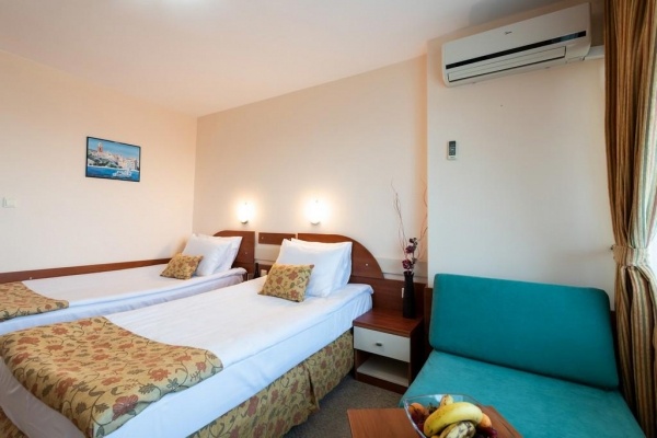 o standard szobák: kb. 19 m?, max. 2+1 vagy 3 fő részére, parkkal szemben, oldalról tengerre néző vagy tengerre néző kilátással