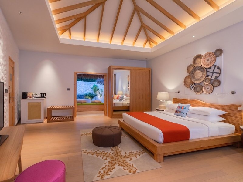 - Water Bungalow (BUM1), bungaló, alsó korhatár: 12 év, tenger felőli, lagúna felőli, tengerre néző, kb. 63 m², utolsó teljes felújítás 2019-ben, összesen szobaszám ebben a szobatípusban: 1, elrendezés: a következő: kombinált nappali/hálószoba, 1 franciaágy, kiságy: ingyenes, igény szerint, klíma: ingyenes, január-december, egyénileg állítható, padló: parketta, széf: ingyenes, mennyezeti ventilátor, kanapé, íróasztal, vasaló, vasalódeszka, kávéfőző, kávé/teafőző, vízforraló, Minibár: térítés ellenében, üdítők: térítés ellenében, víz: térítés ellenében, alkoholos italok: térítés ellenében, telefon, Internet: WLAN/WiFi : térítésmentesen, TV: a hálószobában, műholdas TV, szobaszerviz: naponta, térítés ellenében, takarítás: naponta, ingyenes, zuhanyzó, fürdőkád integrált pezsgőfürdővel, WC, fürdőköpeny: ingyenes, papucs: ingyenes töltés, hajszárító, terasz nyugágyakkal
