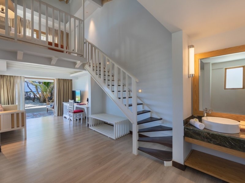 - Junior Beach Suite (JSM1), bungaló, tenger felőli, lagúna felőli, tengerre néző, kb. 95 m², utolsó teljes felújítás 2019, teljes szobaszám ebben a szobatípusban: 1, elrendezése: kombinált nappali/hálószoba, 1 db franciaágyas ágy, babaágy: ingyenes , kérésre, klíma: ingyenes, egyénileg állítható, padló: parketta, széf: ingyenes, mennyezeti ventilátor, íróasztal, vasaló, vasalódeszka, kávéfőző, kávé/teafőző, minibár: térítés ellenében, üdítők: térítés ellenében, víz: térítés ellenében , alkoholos italok: térítés ellenében, telefon, Internet: WLAN/WiFi: ingyenes, TV: a hálószobában, műholdas TV, szobaszerviz: naponta, térítés ellenében, takarítás: naponta, térítésmentesen, kültéri zuhanyzó, fürdőkád, wc, fürdőköpeny: térítésmentesen, papucs: térítésmentesen, hajszárító, terasz: ülőgarnitúrával