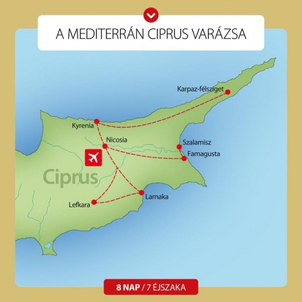 Utazás repülővel Budapestről átszállással Ciprus fővárosába, Nicosiába. Idegenvezetőnk az Ercan reptéren fogadja Önt. Transzfer a hotelbe. Szállás: Famagusta/Iskele környékén az ország török oldalán.