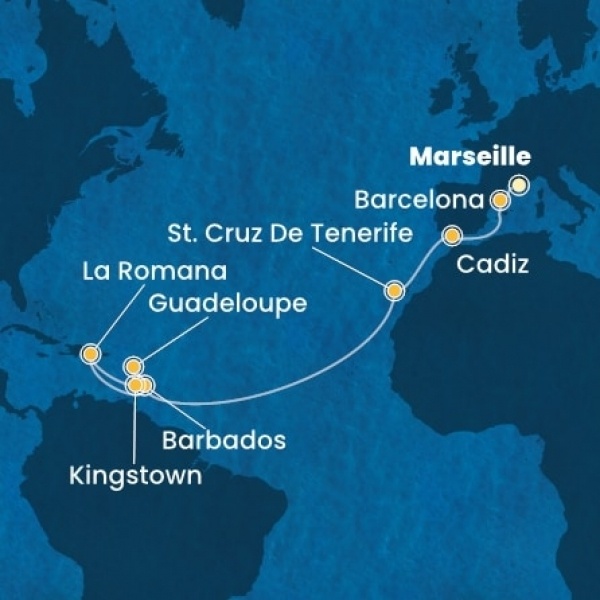 | 13. nap | Barbados (Holland Antillák (ABC-szigetek)) | 08:00 | 18:00 |
