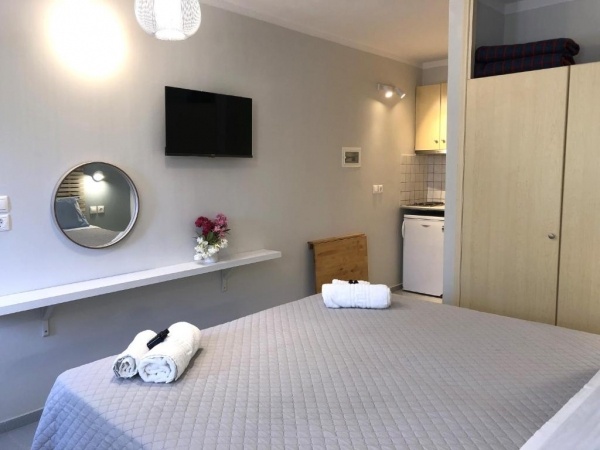 - 2 ágyas részben tengerre néző stúdió: A kétágyas, erkélyes/teraszos, mediterrán stílusú, egyszerű berendezésű stúdiók részlegesen tengeri kilátással rendelkeznek. A stúdiók kis alapterületűek, ezért maximum 2 fő elhelyezésére alkalmasak, nem pótágyazhatóak. Minden stúdió műholdas televízióval, konyhasarokkal, hűtőszekrénnyel felszerelt, főzőlap, kávéfőző, vízforraló és kenyérpirító is rendelkezésre áll. A fürdőszoba zuhanyzós, törölközővel ellátott.