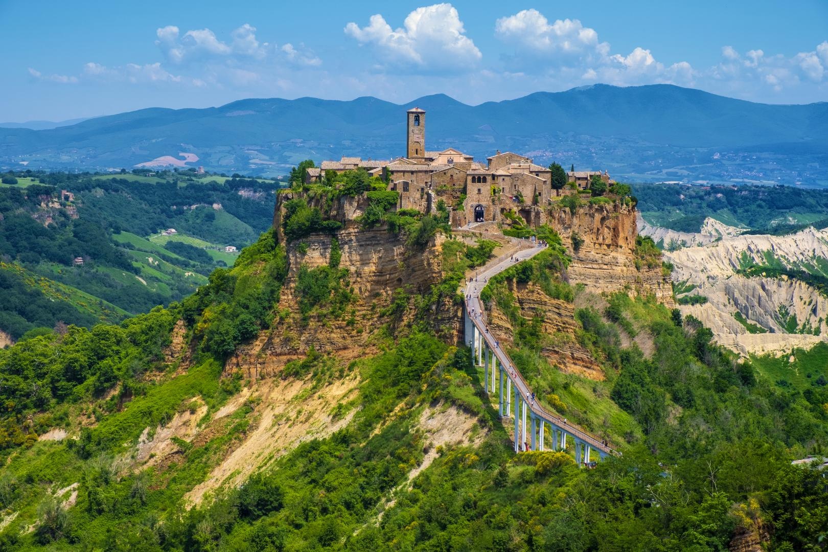 Mai első megállónk, a régió egyik legbájosabb városa Spoleto lesz. Felkeressük a 'Santa Maria Assunta' Bazilika épületét, majd ismét Don Matteo nyomába szegődünk. Városnézésünkből nem maradhat ki a film szerinti Don Matteo templom, a 'Sant'Eufemia Bazilika' épülete sem, majd következik a 'Piazza Campello', a város legmagasabb pontja, ahonnan a völgyre nyíló panorámában gyönyörködhetünk. Látványos és izgalmas látnivaló lesz a 'Ponte delle Torri' hídja is, ahol Don Matteo is gyakran kerékpározott. Továbbutazás az Umbria és Lazio határán fekvő Civitá di Bagnoregio városába, mely Itália legszebb települései közé tartozik. A tufasziklára épült ’Haldokló város’, ahogyan az író Bonaventura Tecchi elnevezte, már messziről is megkapó látványt nyújt. Az etruszkok által, 2500 éve alapított város Itália egyik legrégebbi útja mentén fekszik. A különleges hangulatú várost gyalogosan közelítjük meg egy több száz méter hosszú keskeny hídon keresztül. A gyönyörű környezetben megbújó, egykor nyüzsgő városkában ma már nagyon kevesen élnek, így nem csoda, ha úgy érezzük majd a középkori hangulatú városközpontban sétálva mintha megállt volna itt az idő. A vidékre nyíló kilátás a városból szemet gyönyörködtető és egyben érdekes látvány a szél és az eső formálta különleges agyagfelszín. Séta a festői kis utcákban, majd folytatjuk utunkat a tufasziklára épült Orvieto városába. Látogatás a varázslatos középkori óvárosban, ahol megtekintjük az Itália csodájának nevezett monumentális Dómot, melynek híres 'San Brizio' kápolnájában 'Fra Angelico' és 'Luca Signorelli' freskói díszítik a falakat. Rövid szabadidő, borkóstoló a híres orvietói borokból, vásárlási lehetőséggel. Utazás a szálláshelyünkre, Toszkánába. Esti érkezés Chianciano Terme városába.