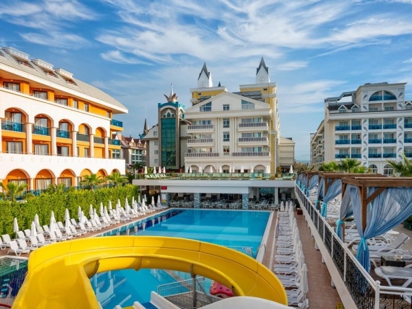 SZOLGÁLTATÁSOK: medence napernyőkkel és napozóágyakkal o beltéri medence o vízicsúszdák o főétterem o bárok o nappali és esti animációs programok o esti showműsorok o élőzene o törökfürdő o szauna o fitneszterem o darts o asztalitenisz o reggeli torna o jóga o vízi torna o wifi