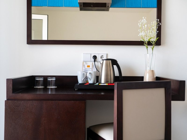 Kétágyas földszint (DZX1) szoba, ami a főépületben helyezkedik el, medence felőli, medencére néző, vagy kertre néző, kb. 24 - 27 m², nappali/ hálószoba, babaágy: térítésmentesen igényelhető, egyénileg szabályozható klíma, széf, minibár (üdítők, alkoholos italok, snackek térítés ellenében), víz térítésmentesen, telefon, ingyenes WiFi, síkképernyős TV, takarítás naponta, zuhanyzó, wc, hajszárító, kozmetikai tükör, terasz ülőgarnitúrával.