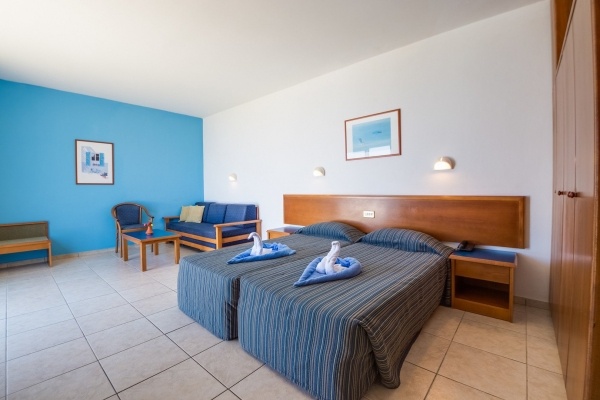SZOBA: stúdió: 2 fő (1 pótágy lehetséges), kb. 35 m2, egyedileg szabályozható klíma, fürdőszoba (kád vagy zuhanyzó, wc), felszerelt konyhasarok (kis hűtő, vízforraló, mosogató, kenyérpirító, evőeszköz készlet), TV, telefon; felár: széf; ingyenes kiságy 2 éves korig érkezés előtti megrendelésre; erkély (asztal és székek), kilátás a környékre; tengerre néző kilátás felár ellenében; lakás: 2 fő (2 pótágy lehetséges), kb. 45 m2, külön hálószoba és nappali, stúdió szoba berendezése; erkély (asztal és székek), kilátás a környékre; tengerre néző kilátás felár ellenében; apartman felár ellenében.