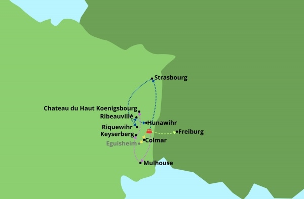 Délelőtt Strasbourgban ismerkedés a történelmi belvárossal, mely az UNESCO Világörökség része, séta a Petite France negyed favázas házai között, majd a hatalmas gótikus katedrális és a XIII. századi fából készült fedett gyaloghidak megtekintése. Délután mesés elzászi falvakba látogatunk! Először Riquewihr városát keressük fel, itt klasszikus középkori kő- és faházak, faragott ablakok, gyönyörű virágos utcák, boltíves udvarok között sétálhatunk. Fő utcáján a legfőbb látnivaló a ,,Felhőkarcoló" - egy ötemeletes ház, mely egyike Elzász legmagasabb épületeinek. Később Ribeauvillébe utazunk, ahol városnéző kisvonattal járjuk be a települést és a szomszédos Hunawihr-t is. Útközben bepillantást nyerünk a közeli szőlőültetvények életébe, gyönyörködhetünk a környék panorámájában, melyet itt-ott középkori várak díszítenek. Este visszautazás a szállásra.