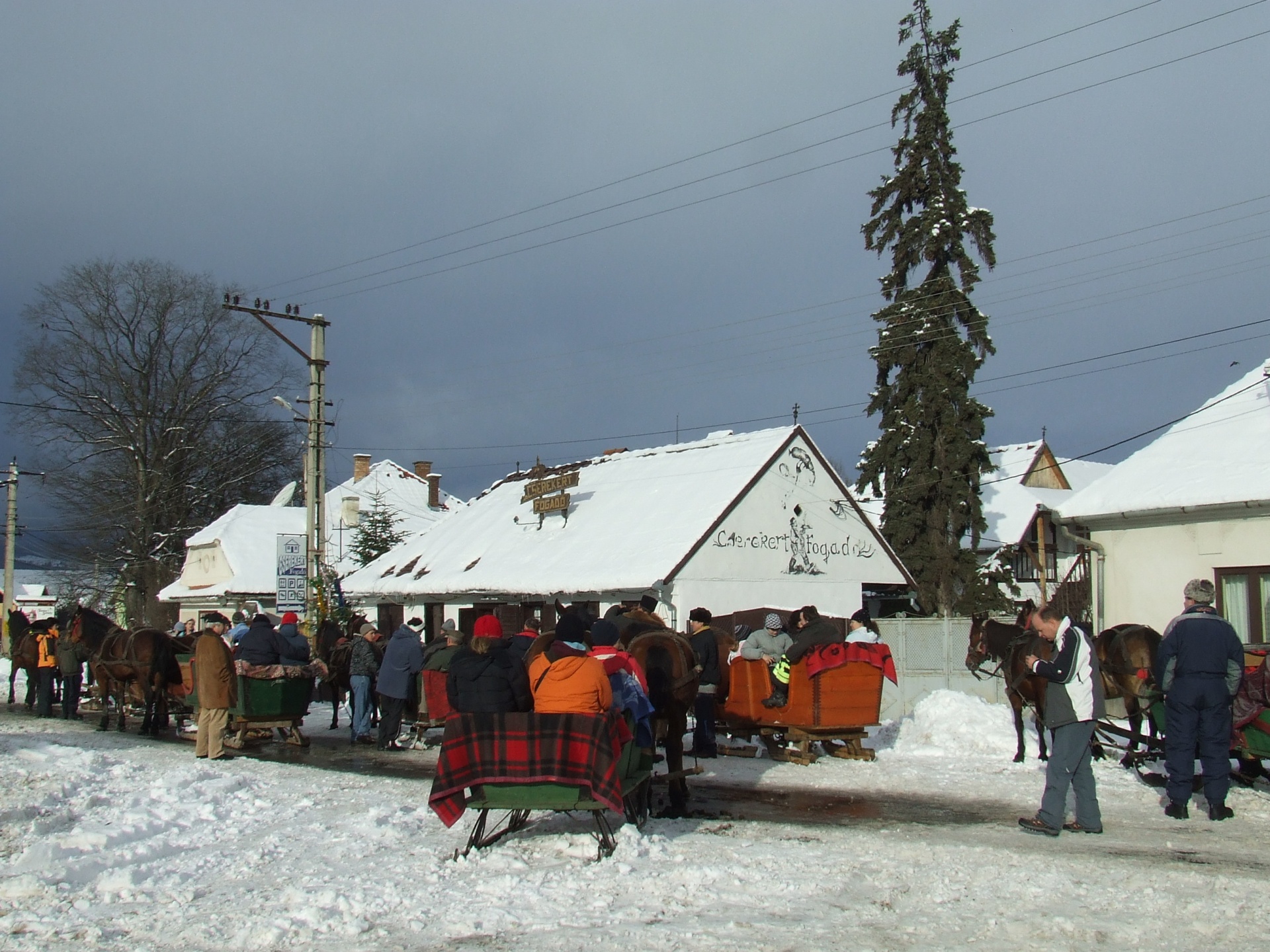 A kivert, havas úton a lovak táltos paripaként repítik a vendégeket a Hargita irányába. A falut elhagyva kinyílik a látóhatár, a szántóföldeket határtalan hótakaró borítja, melyen a napsugár visszaverődik millió kis csillámban. A Hargita, a székelység szent hegye, a téli tájban még felségesebbnek, óriásibbnak tűnik. Az úti cél a Pogányvár alatti tisztás, ahol rövid sétát teszünk a ház körüli erdőben, a havas fenyők csöndjében magunkba szívhatjuk az ősi hegy nyugodtságát. Visszaindulás előtt egy pohár finom pálinkával enyhítjük a tél hidegét, és készülünk fel a hazafelé útra.