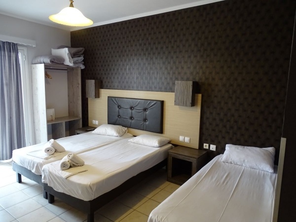 A homokos tengerparttól kb 450 m-re épült, felújított, háromszintes, két épületrészből álló, 60 szobás szállodaegyüttes. A közelben (kb. 200 m) tavernák, kávézók, üzletek, vendéglők találhatók. A közkedvelt szálloda 2019-ben hivatalosan is megkapta a 4. csillagot.