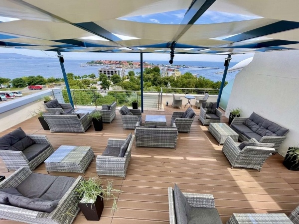 A csak felnőtt vendégeket fogadó modern hotel Neszebár régi és új városrésze között, a központtól mindössze kb. 500 méterre helyezkedik el egy kisebb hegyoldalon, csupán néhány lépésre a tengerparttól. A szállodából csodálatos kilátás nyílik Neszebár öblére és kikötőjére. A homokos, fürdésre alkalmas strand a hoteltől kb. 300 m-re található, így gyalogosan is könnyedén elérhető.