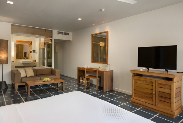 Szuper Deluxe 3 fős szoba körülbelül 86 m?-es, légkondicionált, fürdőszobával, melyben kád és zuhanyzó, WC, hajszárító, köntös és papucs található. A szoba felszereltsége a vezeték nélküli internet, TV, telefon, széf és kávé/tea készlet. Az erkély asztallal és székkel rendelkezik, a szobából tengerre néző kilátásban gyönyörködhetünk. Itt is felár ellenében minibár áll rendelkezésre, fogyasztás szerint.