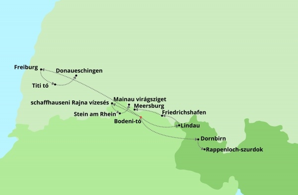 Utazás a Fekete-erdő mediterrán hangulatú ,,fővárosába", Freiburgba. Dél-Németország egyik legszebb városának látnivalói: Münster, ezeréves dóm, városháza. Ezt követően a festői Pokol-völgyön át érkezünk a Titi-tóhoz, séta a tóparton. Útban hazafelé pihenő Donauschingenben, a híres Duna-forrásnál. Este visszautazás a szállásra.