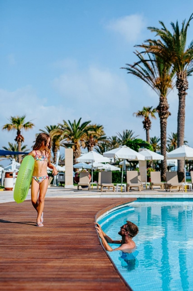 Fekvése: A Louis Ledra Beach Hotel a festői Paphos városának délnyugati partján, Kato Paphos elnevezésű részén, közvetlenül a tengerparton helyezkedik el. A hotel lenyűgöző kilátást nyújt a Földközi-tengerre, és könnyen elérhető távolságra található a történelmi látnivalóktól, például a Paphosi kikötőtől, a Királysíroktól, valamint a város nyüzsgő központjától. Ez a többszörösen díjnyertes 269 szobás szálloda a város leghíresebb szállodasorán található. A szálloda közvetlen hozzáférést biztosít egy gyönyörű, homokos privát strandhoz, mely a szálloda kertjén keresztül érhető el, az itt található strandon a part homokos (a tengerben inkább már kavicsos és sziklás). A szálloda előtti több kilométer hosszú sétányon akár a kikötőig is könnyedén eljuthatunk. Paphos városközpontja és a kikötő 2 km-re fekszik. A térség egyik legszebb strandja a Coral Bay kb. 10 km-re (taxival ~20 euró) található. Buszmegálló a szálloda közelében.A Louis Ledra Beach Hotel tökéletes választás azoknak, akik szeretnék megtapasztalni Ciprus szépségeit, miközben egy prémium színvonalú szállodában pihennek. Családok, párok és egyéni utazók számára is ideális, hiszen kiváló szolgáltatásokat, kényelmet és változatos étkezési lehetőségeket kínál. Foglaljon most!