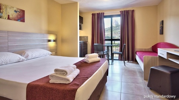 SZOBA: sztenderd szoba: 2 fő (1 pótágy lehetséges), kb. 24 m2, légkondicionált, ventilátor, fürdőszoba (zuhanyzó, wc; hajszárító), kábeltévé, kis hűtőszekrény, kávé/teás készlet, felszerelt konyhasarok, kis sütő; ingyenes kiságy 2 éves korig érkezés előtti megrendelésre; felár ellenében: vezeték nélküli Internet, széf; erkély; superior stúdió: 2 fő (1 pótágy lehetséges), kb. 32 m2, felszereltség, mint egy standard szobában; erkély; egy hálószobás apartman: 2 fő (2 pótágy lehetséges), kb. 42 m2, klimatyzacja (płatna), felszereltség, mint egy standard szobában; erkély; pokoje: studio superior i apartament z 1 sypialnią za dopłatą.