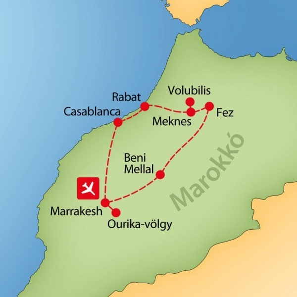 Reggeli, kijelentkezés a hotelből várhatóan a déli órákban. Az Atlasz-hegység felé indulunk, Ourika-völgy kirándulás vár ránk. Festői hegyi falukon haladunk keresztül. A környék híres a gyönyörű patakokról, élénk színvilágról, vadregényes sziklákról, középkori mezőgazdasági tradíciókról. A sétát követően ebédelünk (vacsoracsomag része). A busz a tervezett menetrend szerint az esti órákban viszi ki a csoportot a repülőtérre. Hazautazás átszállással.