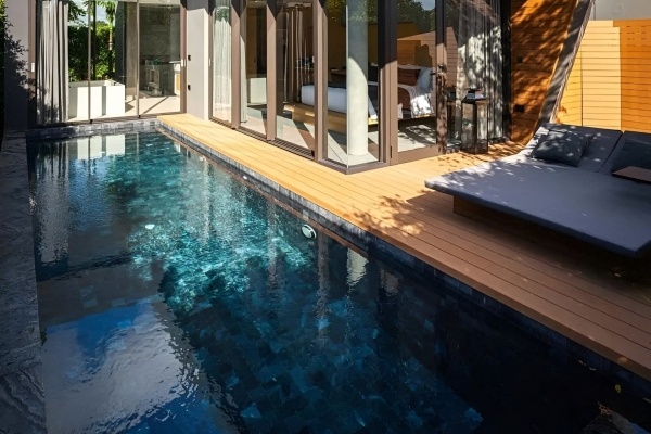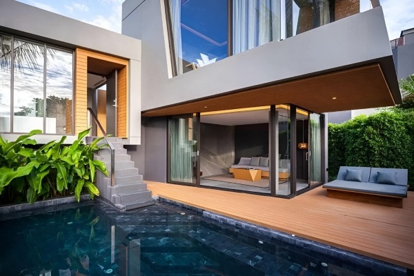 Duplex grand pool villa - kb. 154 m?, klimatizált, üvegezett fürdőszoba (kád, WC, hajszárító), vezeték nélküli internet, 2 smart tv, nespresso kávéfőző, kis hűtőszekrény, terasz asztallal, napozóágyakkal, privát jakuzzis sós vízű medencéhez való hozzáférés, kilátás a környékre. Felár ellenében széf.