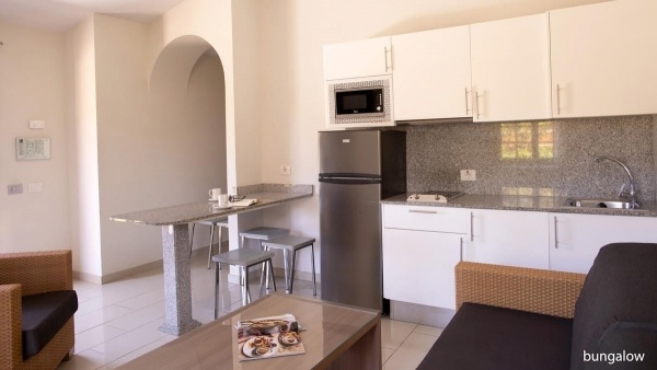 2 fős terasszal rendelkező bungalókban, melyekben lehetőség van pótágyazásra 2 felnőtt vagy 2 gyermek részére (kanapéágy). A szobák 46 m? területűek és tartozik hozzájuk egyénileg szabályozható légkondicionáló, fürdőszoba (kád vagy zuhanyzó, wc, hajszárító), nappali felszerelt konyhasarokkal és a hálószoba ajtóval elválasztva. Elérhető a szobákban vezeték nélküli internet, televízió, telefon és hűtőszerkény is.