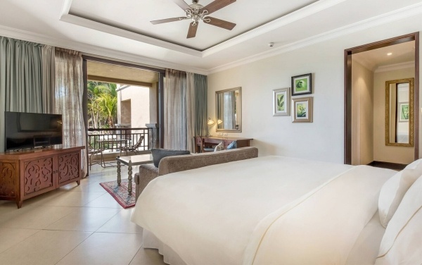 turtle bay junior suite szoba: kb. 63 m2 alapterületű, világos színekkel és stílusos berendezéssel. Benne fürdőszoba káddal, külön tusoló, WC, hajszárító, fürdőköpeny, vasaló és vasaló deszka, légkondicionáló, TV, telefon, WiFi, minibár, tea/kávéfőző, széf, balkon vagy terasz a tenger felöli oldalon