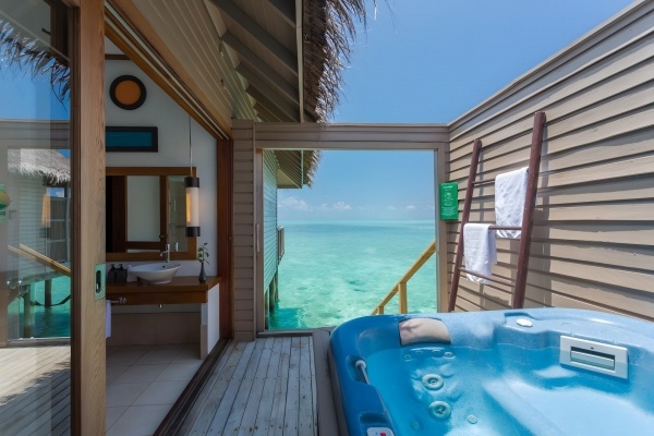 A jacuzzis vízi villa csak felnőtteknek (18+), két fő részére alkalmas, egy pótágy lehetőségével. Az alapterülete körülbelül 85 m?, és a ház a vízen található. A felszereltsége megegyezik a standard szobáéval. A teraszon asztal és székek találhatók, közvetlen lejárattal a tengerhez, valamint privát jakuzzival. A jacuzzis vízi villa felár ellenében vehető igénybe.