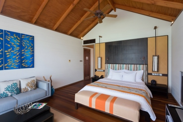A vízparti villa csak felnőtteknek (18+), két fő részére alkalmas, egy pótágy lehetőségével. Az alapterülete körülbelül 60 m?, és a felszereltsége megegyezik a standard szobáéval. A teraszon asztal és székek találhatók, közvetlen lejárattal a strandra, valamint közvetlen tengerre néző kilátással és privát jakuzzival. A vízparti villa felár ellenében vehető igénybe.