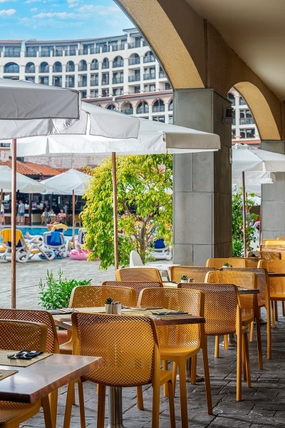 3 főétterem: Nessebar, Estrellas Ibericas, La Spiagggia del Sole - büféasztalos ételek, nemzetközi és bolgár konyha, show cooking, tematikus büfék (1 minden épületben, a szezonon kívüli elérhető éttermek száma a telítettségtől függően változhat