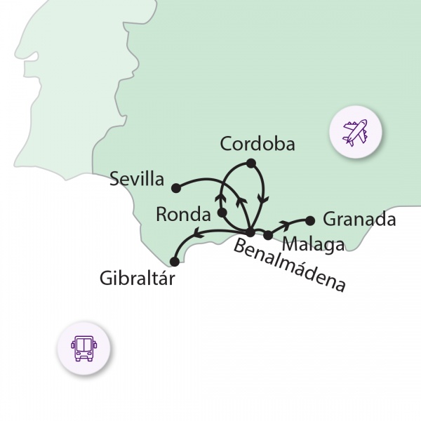 Reggeli után indulunk Rondába. A neve megtévesztő lehet, hisz Andalúzia egyik legaranyosabb, sziklára épült településéről van szó. Fő látnivalók: az Új Híd, a bikaviadal Aréna és a Főtér épületei. A hídról mesés a rálátás a környékre és száz méter mély szurdokba. Rondát elhagyva folytatjuk utunkat Cordobába. A városban a mór építészet egyik legszebb alkotása található, ez a Mezquita, mely Világörökség. A monumentális épület a világ legkülönlegesebb mecsetje, amelyben 850 oszlop, és egy keresztény templom(!) is fellelhető. Ilyen jellegű építményt sehol máshol a világon nem találhatunk. Az óvárosi sétánk során felkeressük a Virágok utcáját, Európa legrégebbi fürdőjét és a Guadalquivir folyón átívelő római kori hidat is. A hófehér házakkal tarkított, kanyargós utcákon sétálva sok bájos belső kertet (patiot) láthatunk. A tartalmas nap végén visszatérünk szállásunkra.