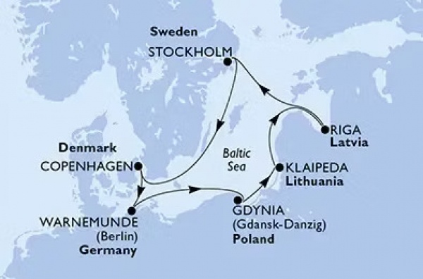 Warnemünde (Berlin) (Németország), Gdynia (Gdansk-Danzig) (Lengyelország), Klaipeda (Litvánia), Riga (Lettország), Stockholm (Svédország), Koppenhága (Dánia), Warnemünde (Berlin) (Németország)