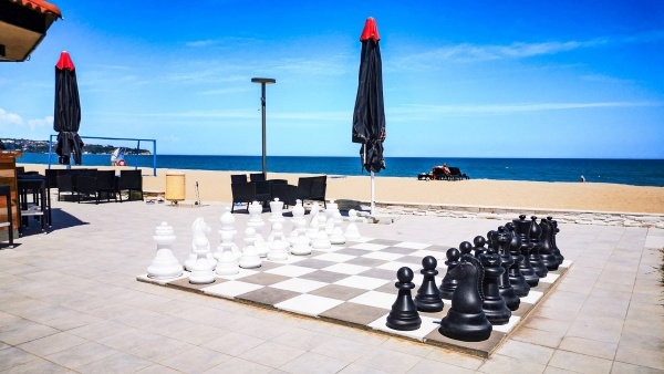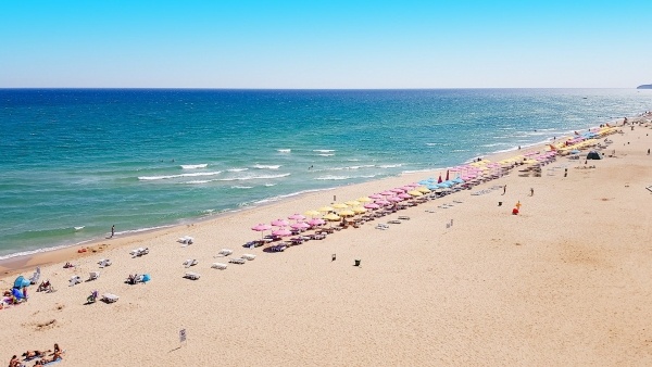A nyilvános strand hosszú, homokos/aprókavicsos és lassan mélyülő. Fizetés ellenében napernyők és napozóágyak bérelhetők (külső szolgáltató által biztosított).